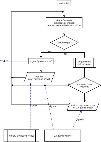 Some of the more subtle aspects of worker processing (e.g. enqueue thread signaling and other fine things) have been left out in order to get the big picture. What is called "check DA mode switchback..." right after "worker init" is actually a check for the worker's termination criteria. Typically, the worker termination criteria is a shutdown request. However, for a DA worker, termination is also requested if the queue size is below the high water mark AND the DA queue is empty. There is also a third termination criteria and it is not even on the chart: that is the inactivity timeout, which exists in all modes. Note that while the inactivity timeout shuts down a thread, it logically does not terminate the worker pool (or DA worker): workers are restarted on an as-needed basis. However, inactivity timeouts are very important because they require us to restart workers in some situations where we may expect a running one. So always keep them on your mind.