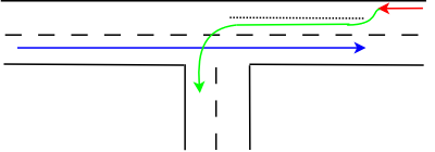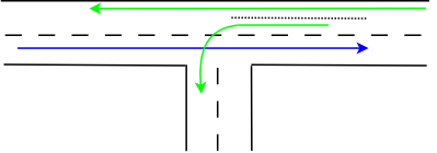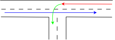 This is a very simple real-life traffic case: one road joins another. We look at traffic on the straight road, here shown by blue and green arrows. Traffic in the opposing direction is shown in blue. Traffic flows without any delays as long as nobody takes turns. To be more precise, if the opposing traffic takes a (right) turn, traffic still continues to flow without delay. However, if a car in the red traffic flow intends to do a (left, then) turn, the situation changes: