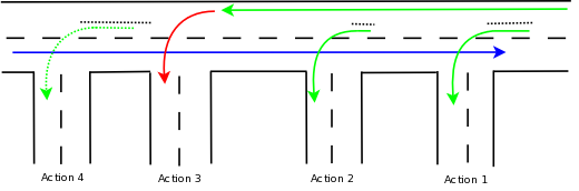 We need to read this picture from right to left (otherwise I would need to redo all the graphics ;)). In action 3, you see a 0-sized turning lane, aka an action queue in "direct" mode. All other queues are run in non-direct modes, but with different sizes greater than 0.